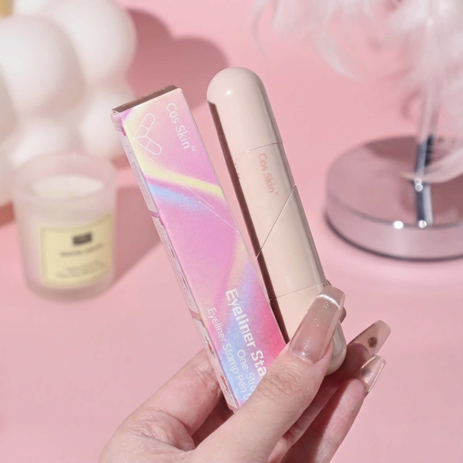1️⃣ Stamp: Position the stamp at the outer corner of your eye. Press down gently but firmly to create a crisp, sharp wing.